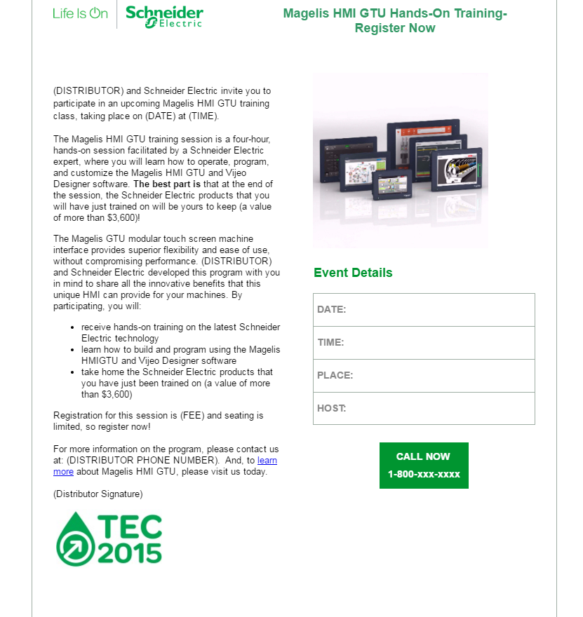 - Produce three emails -branded with the Schneider Electric and the distributor’s logo. The emails will be invitations to participate in the Magelis Quick-Start customer education events hosted at the distributor’s location.